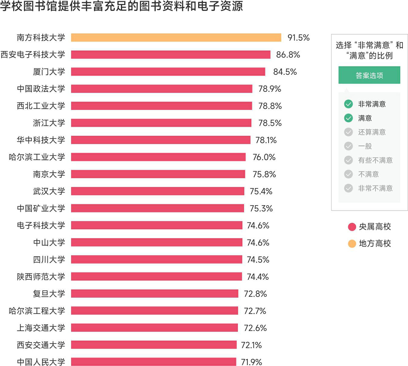 “学校图书馆提供丰富充足的图书资源和电子资源”,是学生最满意的一项,57.6%的国内学生对母校的图书馆资源表示认可。具体到高校数据,排名前20的高校学生满意度均高于70%。其中,南方科技大学的满意度高达91.5%,为全国高校之最,也成为该项目上唯一挺入前20的地方高校。西安电子科技大学与厦门大学分别有86.8%和84.5%的学生对学校图书馆资源感到满意,位列第二、第三,央属高校的学生对学校的图书馆满意度普遍较高。