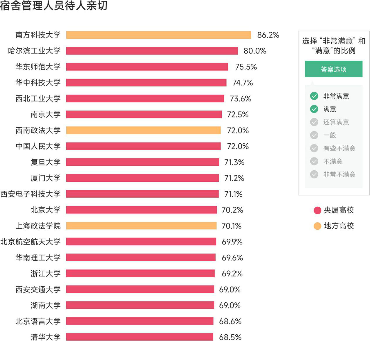 宿管服务的受关注程度排名在第13名。宿舍管理服务部门和宿管人员是大学生在校园生活中接触较多的部门和人员之一,其关系密切程度不亚于院系的行政管理人员。哪些高校的宿管服务做的更到位,更令人满意呢?按照调查结果,在全国范围内,有57%的学生对此表示满意或非常满意。具体来看,南方科技大学再次一枝独秀占得头筹,有86.2%的参评学生对此表示满意或非常满意。排名第二的哈尔滨工业大学同样数据极其出色,其满意度高达80%。此外华东师范大学、华中科技大学、西北工业大学名列该项目的第三到第五名。值得一提的是,在一众央属高校中,西南政法大学和上海政法学院两所政法类地方公办高校的满意度结果也非常突出,均超过了70%。