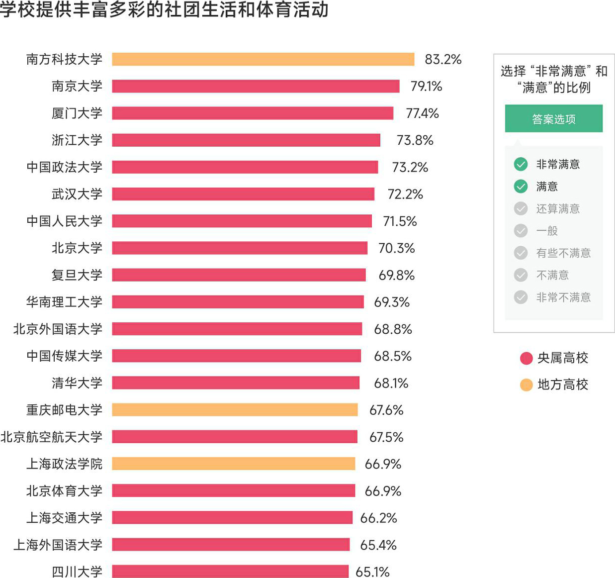 社团和体育活动是丰富多彩的大学生活的重要组成部分。在“学校提供丰富多彩的社团生活和体育活动”选项中,有53.9%的大学生表示满意或非常满意。具体到学校层面,南方科技大学的满意程度排名第一,选择满意或非常满意的比例为83.2%,领先国内其他高校。南京大学以79.1%的比例排名第二,厦门大学以77.4%的比例排名第三。前三甲的满意比例相比其他高校也拉开了明显的差距。此外浙江大学、中国政法大学、武汉大学、中国人民大学、北京大学在该选项的满意度也都超过70%。