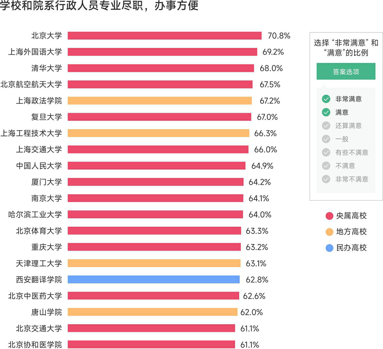 对于学生而言,在校园生活中,除了最基本的学习、和老师同学的交流,与学校的众多行政服务部门打交道也是很重要的一部分。“学校和院系行政人员专业尽职,办事方便”这一选项的学生关注度排在31个调查选项的第16位,但所有学生的整体满意度仅有50.3%,在31个调查选项中排名第24名。可以看出国内高校在行政服务方面仍有较大的进步空间。具体来看,北京大学的在该项目上表现最佳,有70.8%的学生选择满意或非常满意。上海外国语大学的比例为69.2%,排名第二;清华大学以68%的满意或非常满意比例排名第三。值得一提的是,在该项目上,民办高校西安翻译学院从众多高校中脱颖而出,以62.8%的满意度跻身20强,排在全国高校的第16名。