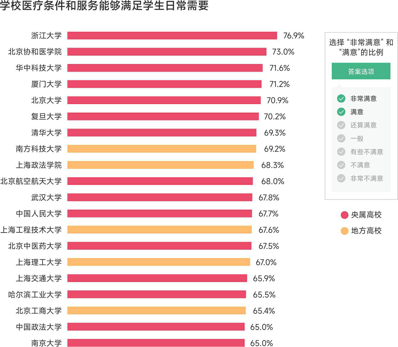 学校的医疗条件和服务事关学生的生命健康,也是大学生十分关注的方面之一。在今年的调查结果中,51.9%的大学生对此表示满意或非常满意。浙江大学脱颖而出,获得了最高的满意度评价,有高达76.9%的学生对学校提供的医疗条件和医疗服务表示满意或非常满意。在该项目满意度排名的前20高校中,有两所医药类高校上榜,分别是排名第二的北京协和医学院和排名第十四的北京中医药大学,可见医药类高校本身自带良好的医疗服务属性,优势明显。此外华中科技大学、厦门大学、北京大学、复旦大学的医疗服务满意度也都超过70%。从学校层次角度来看,央属高校的医疗服务满意度优势突出。在地方公办高校中,南方科技大学和上海政法学院排名靠前。