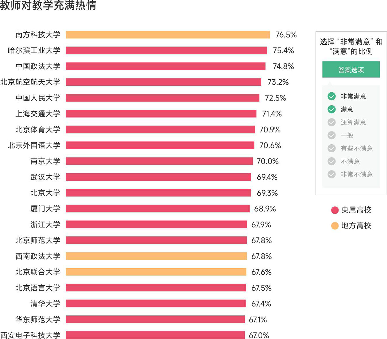 教师的教学热情,对于学生的学习积极性具有极强的感染和带动。在“教师对教学充满热情”方面,国内大学生有53.8%表示满意或非常满意。其中,南方科技大学的满意或非常满意比例为76.5%,排名全国第一。哈尔滨工业大学有75.4%的参评学子认为学校在这方面做得较好,选择了满意或非常满意。中国政法大学有74.8%的同学为母校投下了满意票。此外北京航空航天大学、中国人民大学、上海交通大学、北京体育大学、北京外国语大学和南京大学的满意或非常满意比例也在70%及以上。
