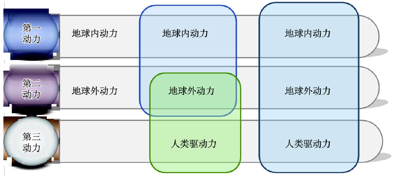 对于发生在陆地表层的自然和人文现象的时空格局及变化过程,均受自然内营力、自然外营力和人类活动的驱动(图1-2)。由于传统地理学研究的时间尺度集中在千年、百年和年季尺度,空间尺度集中在地方和区域尺度,长期以来地表格局与过程研究以外动力解析为主,进而理解陆地表层水、土、气、生和人的行为,以及各要素的相互作用关系。随着地理学研究时空尺度的拓展,地球内动力对地表过程的影响成为认识地表过程不可缺少的动力因素,对地表过程的认识迫切需要从岩石性质、构造运动等方面加以理解。地理机制研究逐渐从单一外动力源向内外动力源转变,为解释地理过程的驱动机制创造更加合理、科学的逻辑基础。人类社会进入工业化以来,人类活动对地表状态、变化过程的影响越来越大,已经成为陆地表层变化过程的又一新的动力源。今天的人类活动已经成为与地球内动力和地球外动力同等重要的改造地表过程的强大营力之一。由于地球内动力、外动力和人类活动驱动力的作用范围、作用强度、作用方式、作用时间/空间尺度存在着明显的差异,针对不同的地表过程,从特定的角度研究和理解动力学机制是地理学发展的时代需求。地球内动力、地球外动力和人类活动驱动力存在复杂的叠加效应,使得地表状态和变化过程更加复杂,因而科学理解陆地表层的动力驱动方式是认识陆地表层变化规律的科学基础。