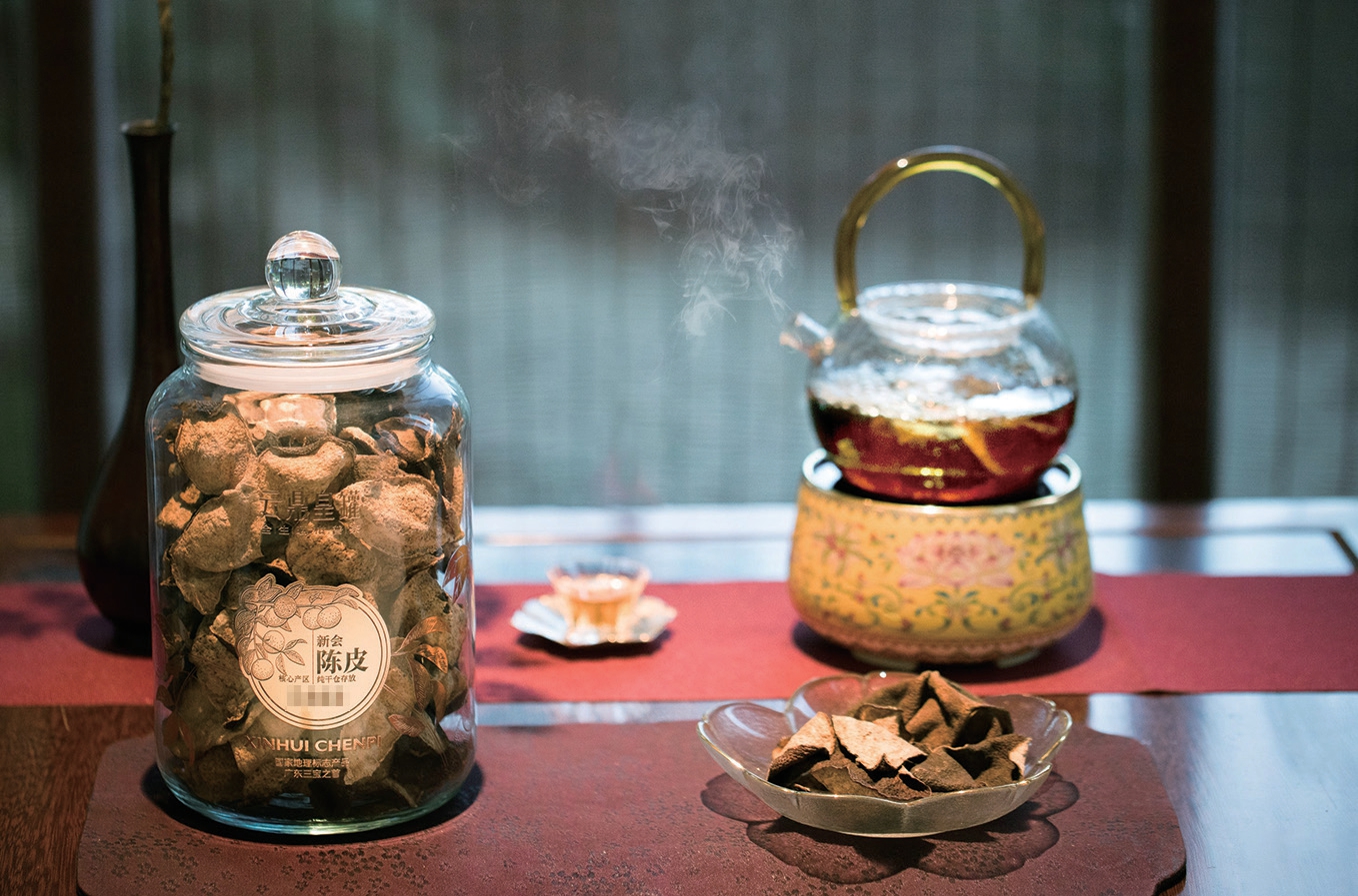 新会是著名的“陈皮之乡”,以美食为天的岭南人,把陈皮视为广东“三宝”之一,与新会陈皮朝夕相处,将陈皮运用到极致。外焦里嫩的陈皮排骨、香醇的陈皮老鸭汤、甜而不腻的陈皮绿豆沙,炖汤烧菜、蒸鱼做肉、制作甜品味料都离不开陈皮。陈皮久煎不易烂,甘香可口,齿颊留香,陈皮虽然不是主菜,却能令主角大放光彩,不但增加了食物的香味,还起到食疗养生的作用。