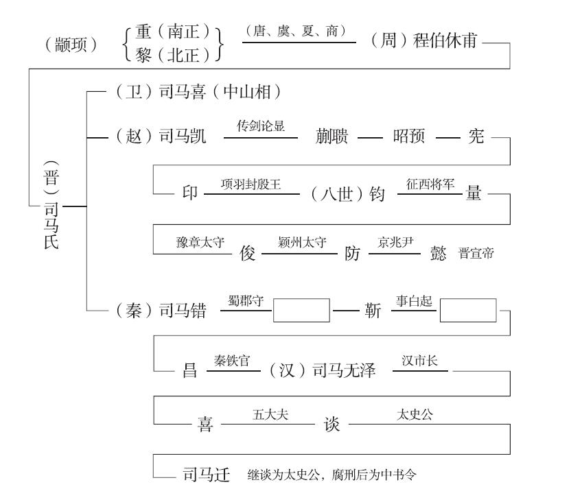 司马迁在《太史公自序》中追述司马氏世系,源远流长,始祖为唐虞之际的重黎氏,历唐虞夏商,世典天官,至周世典周史,历代相传一千余年,这是司马谈自认最为光荣的家世,即史官世家。司马谈引为自豪,表明他以修史为己任,是一个自觉的历史家,并以此教育司马迁。其实,司马氏之姓来源于西周宣王时一位辅佐王室中兴的将军,封于程,伯爵,名叫休甫,史称程伯休甫,做了掌军事的司马,其后子孙称司马氏。司马氏远祖世系盖世代口碑传说,程伯休甫系重之后还是黎之后,司马迁不能明,而统言之“重黎之后”。颛顼之世,重、黎为二人。重为南正,古代天官,观星象,定历法;黎为北正,古代地官,执掌农事。先秦典籍《尚书·吕刑》《左传》《国语》等书都记载了有关重、黎二人在颛顼之时分司天地的传说。