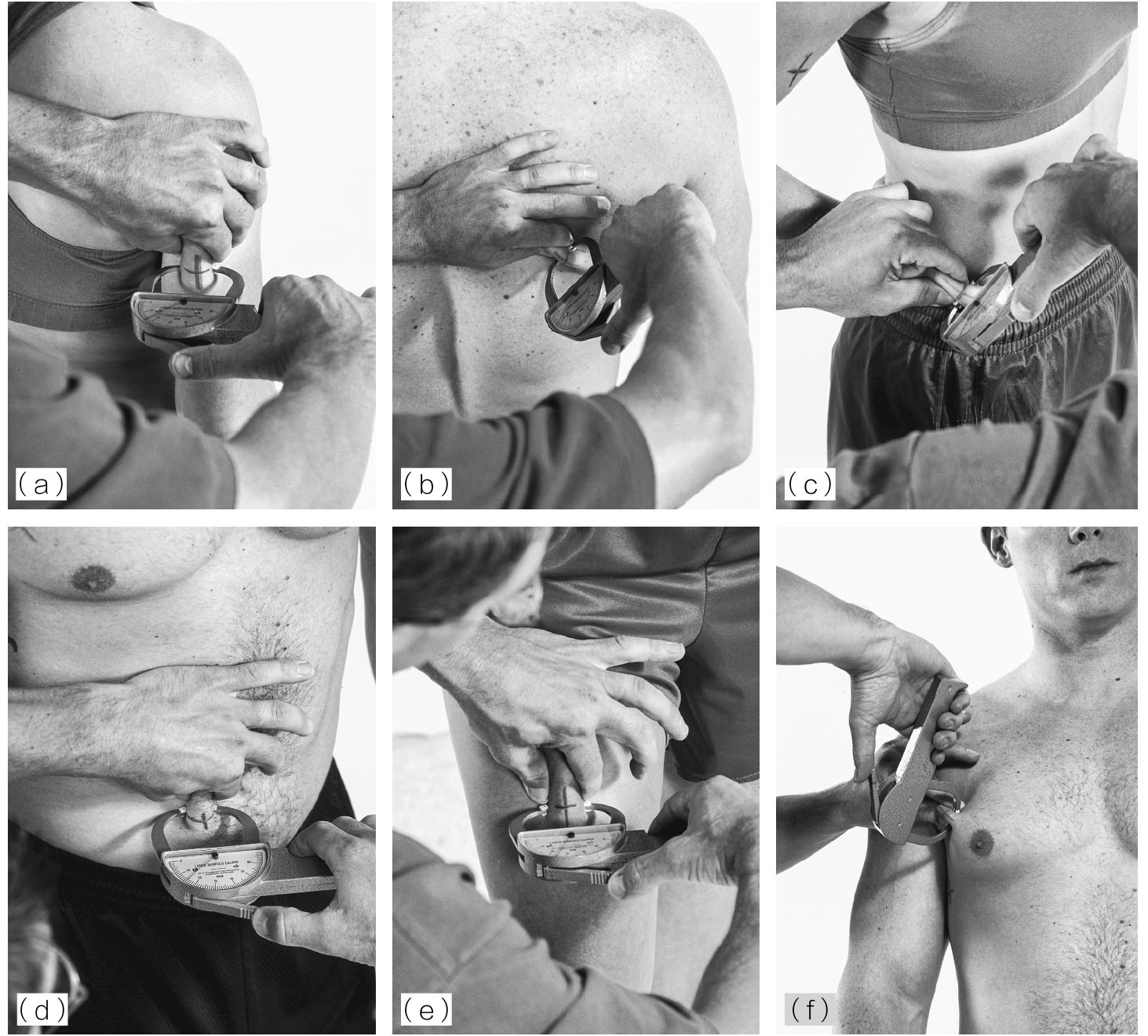 图2.1 使用皮褶钳测量(a)肱三头肌、(b)肩胛、(c)前腰、(d)腹部、(e)大腿、(f)胸部的皮褶厚度