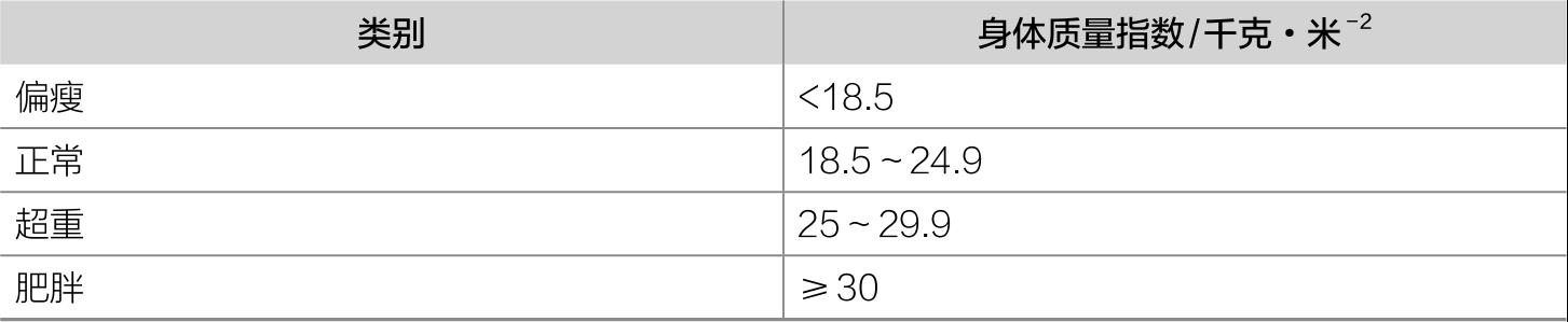 根据测量结果,人可以分为偏瘦、正常、超重和肥胖4类。身体质量指数是衡量人群肥胖率的一种简单方法,但是它不太适用于评估个体。表2.1列出了身体质量指数的类别。