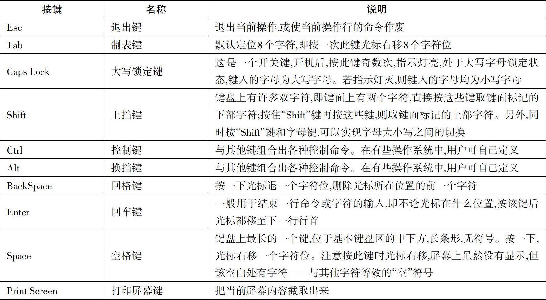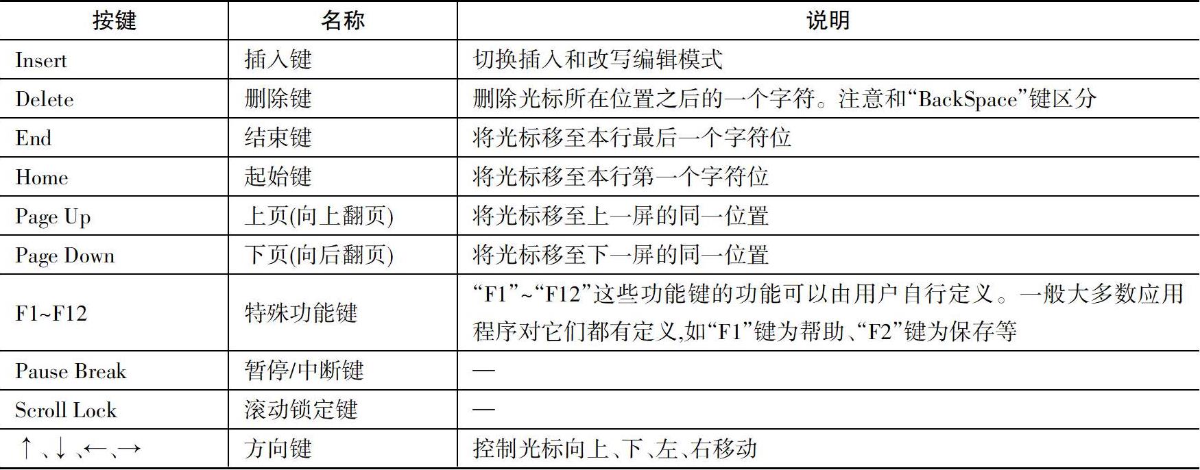 键盘中的一些按键本身有特殊功能,这些功能也是我们经常用到的,下面对其进行简单的介绍,如表2-2所示。