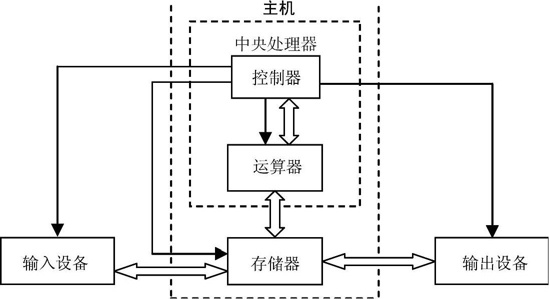 计算机有运算器、控制器、存储器、输入设备和输出设备这5个基本部件,以存储器为中心,计算机硬件系统的组成如图2-1所示。