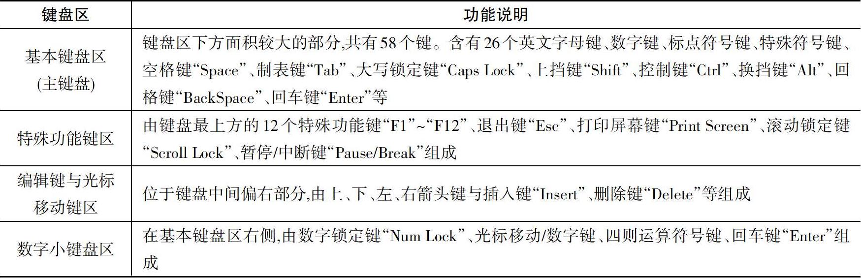 101键标准键盘分为4个区域,各区域的功能说明如表2-1所示。
