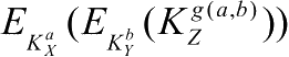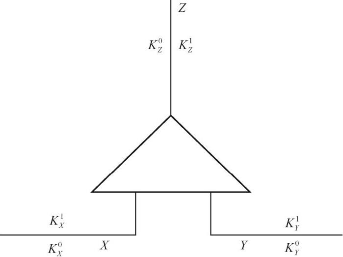 混淆电路结构如图2-1所示,其中 X 和 Y 为输入导线, Z 为输出导线。这三根导线分别对应两个值:0和1(即输入导线的输入值和输出导线的输出值)。例如,每当输入值 a 与 b 被选中后,通过混淆电路的任务就是安全地计算 g ( a , b )的值。