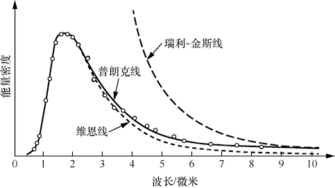 当时德国的物理学家维恩得出一个维恩位移定律[式(1-1)]。根据这个定律,热辐射的能量密度取最大值时对应的波长 λ m 和温度 T 的乘积是一个常数,也就是说,只要测出了这条曲线的 λ m ,你就可以知道这条曲线所代表的温度。