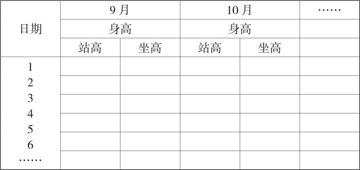 在改进了研究技术后,我决定每月测量孩子们的身高、坐姿和站姿,以便尽可能精确地确定他们的身高与发展的关系。为了使教师的研究工作更有规律性,我制定了一个规则,即测量应在孩子生日所对应的每个月那一天进行。为此,我设计了一张排列如下的登记表。