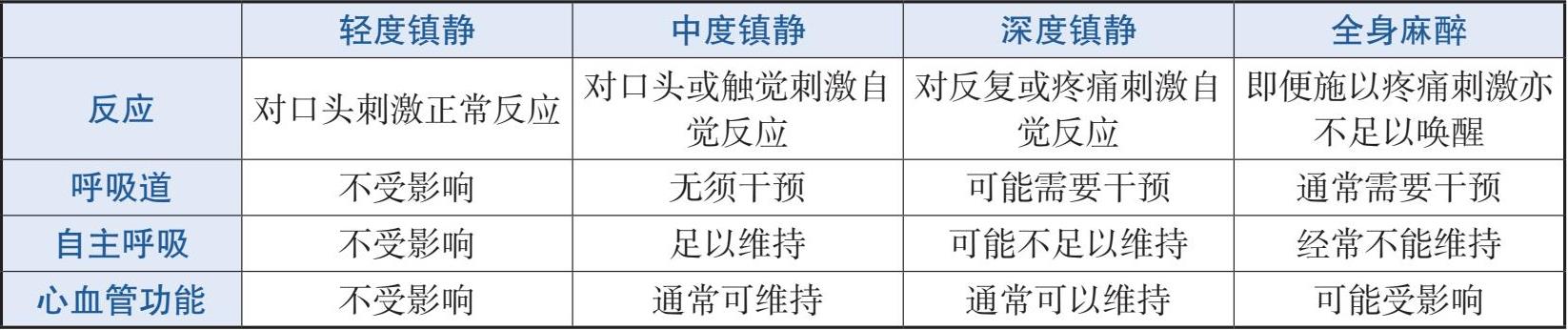 为了建构安全的医疗体系,美国麻醉医学会(American Society of Anesthesiologists,ASA)定义了镇静麻醉的临床表现(表3-1-1),并提出在医院所执行当日手术合并各式镇静麻醉的标准,以及非麻醉医师执行镇静镇痛的操作指南。