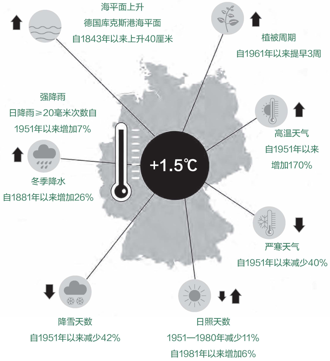 如今,极端天气已经进入了议程。北大西洋的风暴比以往任何时候都要多,美国海岸的飓风也比以往任何时候都要频繁。山火在美国和澳大利亚、巴西等地的大片土地上蔓延数周。气候灾难就发生在我们家门口:据德国气象局(DWD)介绍,自1951年以来,德国的高温天数增加了170%,下雪的天数则减少了42%。植被比以往提前三周开始生长,枯竭的森林在树皮虫的肆虐下呻吟,库克斯港的北海海平面比1843年的数值高出40厘米。统计数据显示,1881年至2018年,德国的气温上升了1.5摄氏度。气候变迁是真实发生的。(图1-1)
