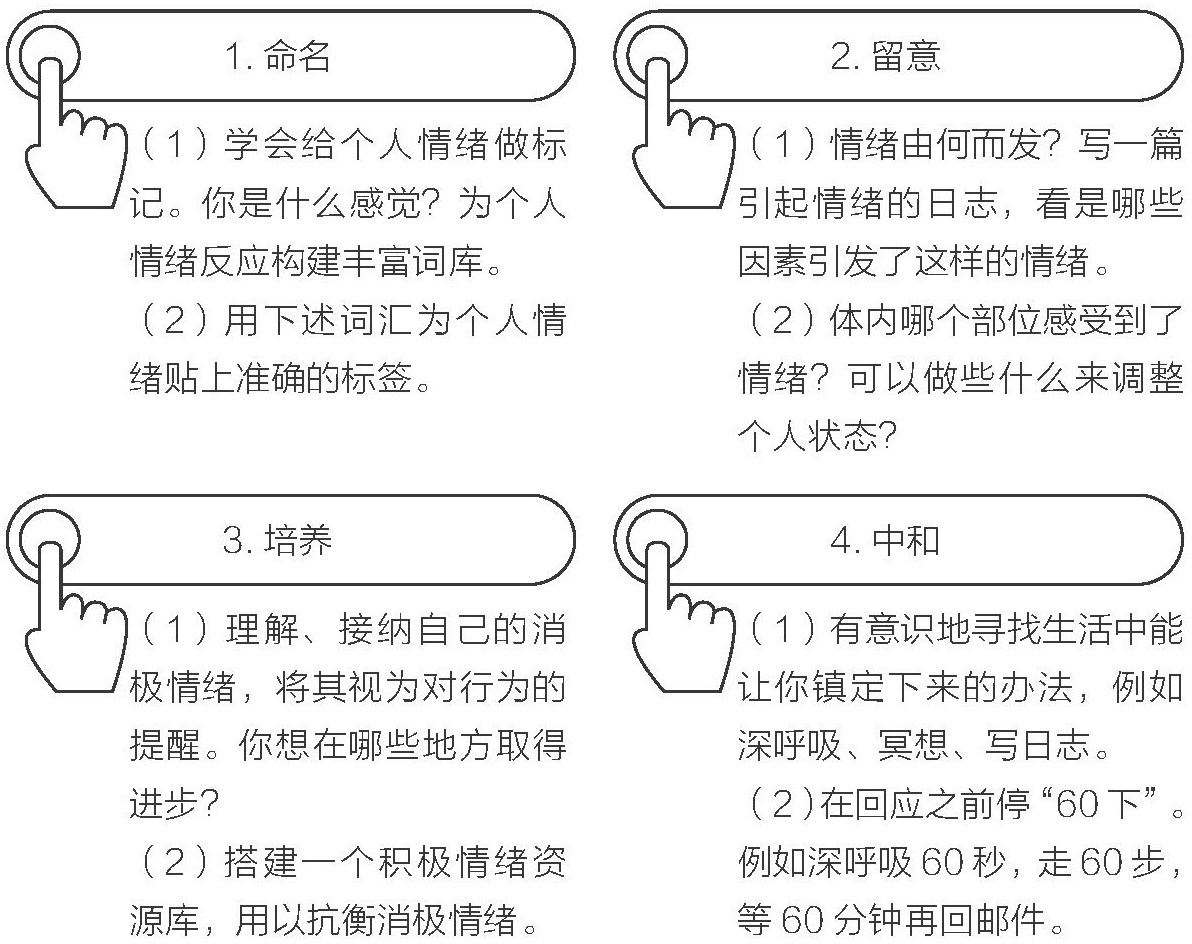 本练习分四部分,有助于调节个人情绪反应。我将每个阶段视为一个“热钮”,用来中和每个阶段的热量,如图2-2所示。