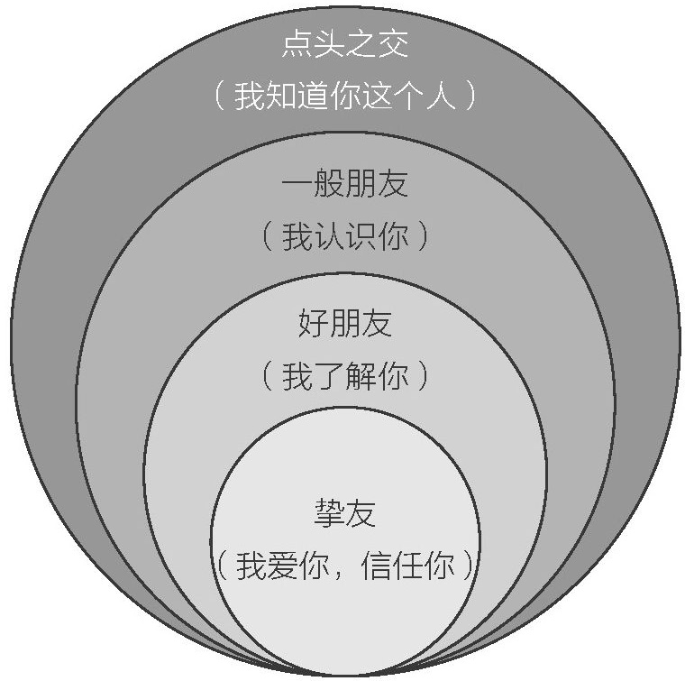 你希望也需要有几个可以依赖的人,工作和生活中都是如此。工作中的困难会让人压力很大,面对困难,人们也容易畏缩不前,放弃社交关系。肖恩·埃科尔(Shawn Achor)的研究表明,我们要做的恰恰相反:“正确应对压力的人,会在面临压力时加大社交投入。”图2-3所示为友谊圈。
