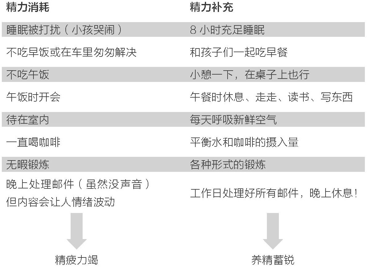 为你自己列一份精力消耗与补充的清单,尽可能诚实地写下所有内容。为了达到一个更优的平衡,你应该摒弃哪些消耗精力的行为?又应该做哪些给你自己充电的事?清单内容应符合个人生活习惯,要写做得到的事,而不是你觉得应该做的事。