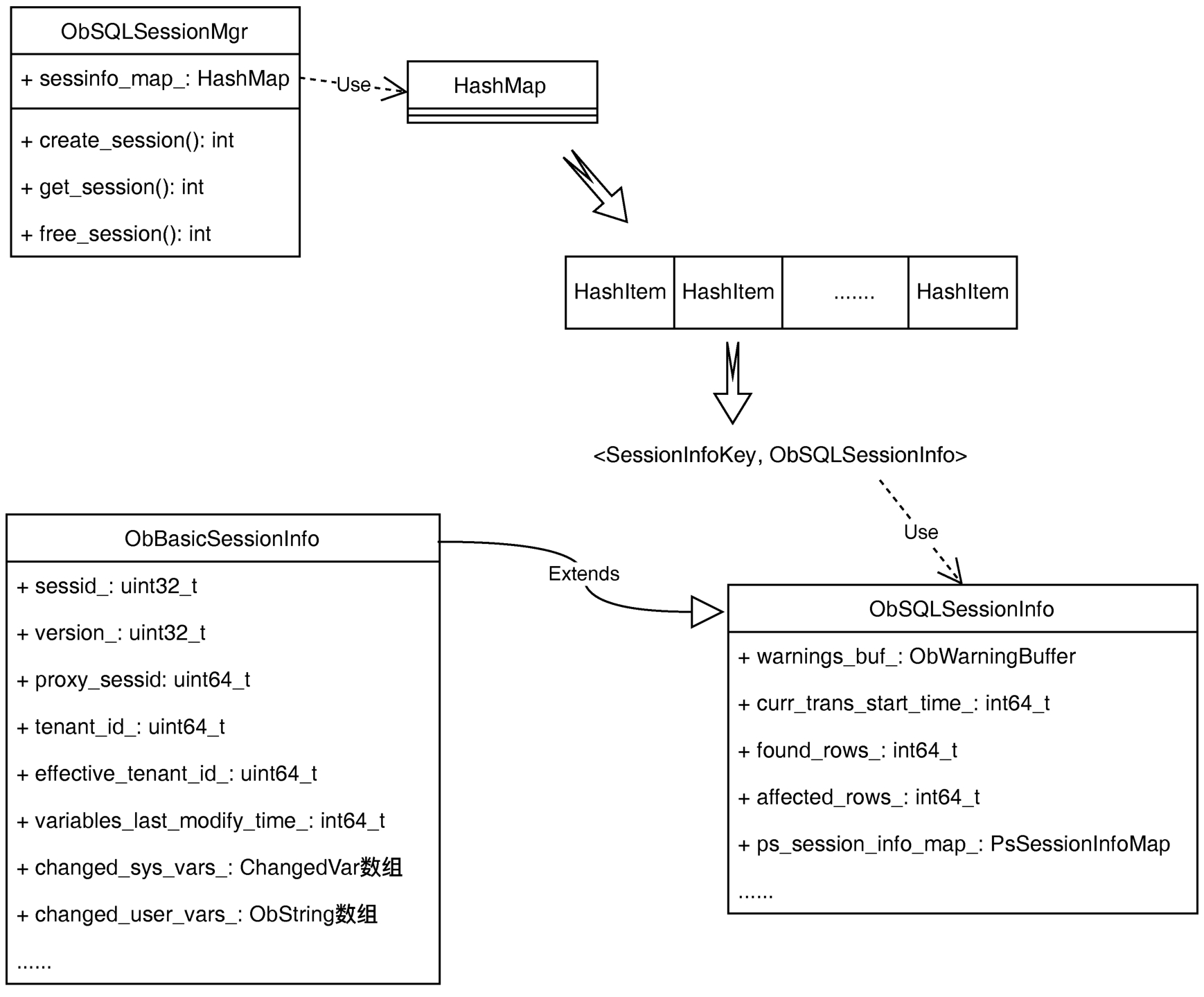 在实现上,OceanBase采用了两个类来管理会话,其主要构成部分如图3.7所示。其中ObSQLSessionInfo对应着会话本身的信息,而ObSQLSessionMgr是会话的管理器。