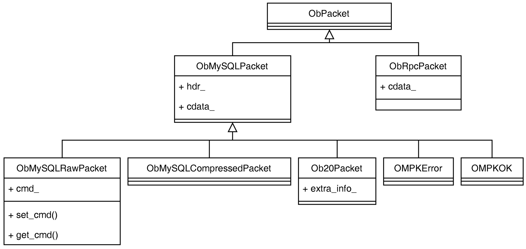 这些协议处理器的作用是将从网络接收到的数据按照相应的协议解析成数据包,如图3.5所示,OceanBase中将数据包表示成以ObPacket为顶层类的一系列子类。其中ObMySQLPacket的子类分别服务于以上三种协议,ObRpcPacket则服务于OceanBase内部节点之间的RPC通信。