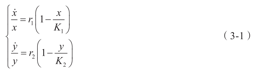 式中, x 和 y 表示两个体当前的生态位宽度, r 1 和 r 2 为与自身生态位及成功率等有关的增长率(内禀增长率), K 1 和 K 2 为无竞争条件下各自生态位宽度的上限。