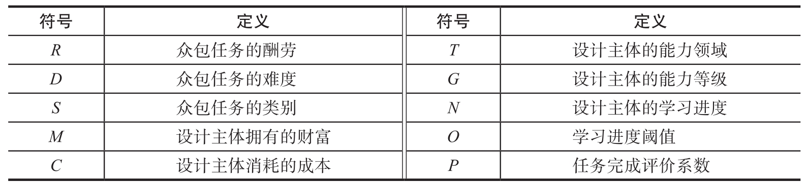 依据上文对众包设计生态系统参与主体的主要属性及行为特征的分析结果,定义见表3-1的符号。