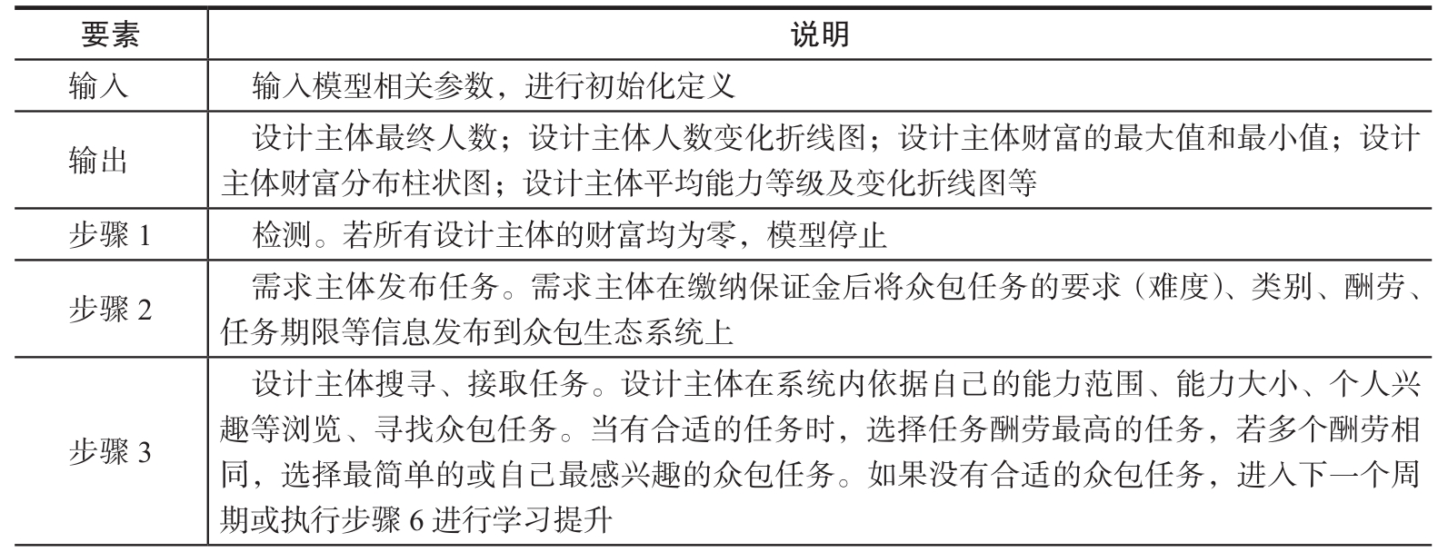 本节在Sugarscape模型 [6-9] 的基础上提出了一种多代理(Agent)的众包设计生态网络演化模型。Sugarscape模型由Agent、环境、规则3个基本组成部分构成,在将众包设计生态系统的各方主体映射到模型中时,设计主体为Agent。Agent具有高度自治性,可以做出选择、判断、执行等行为,为模型的核心,需求主体为环境,平台主体被映射为规则参与到模型中,故众包设计生态网络演化模型实现的过程见表3-2。