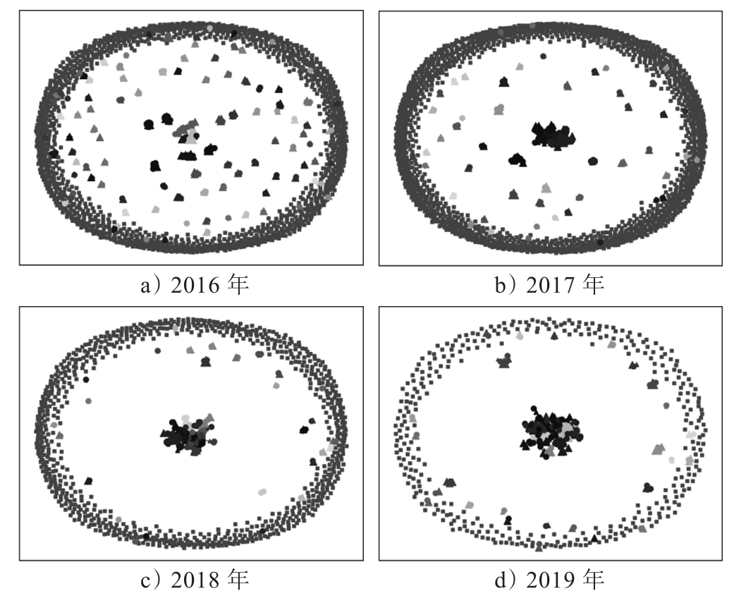 由图3-4可知,生态关系在2016年分布较为均匀,中间节点较少,四周节点较多;而2017年大部分节点都集中在中间部分,四周只有少量节点;到2018~2019年时,几乎所有的节点都集中在中间。此现象说明随着时间的增长,众包设计生态系统中的竞争越来越激烈,早期单个任务的参与者数量较为有限,后期对需求的争夺已非常激烈,导致许多设计方没有交易机会。