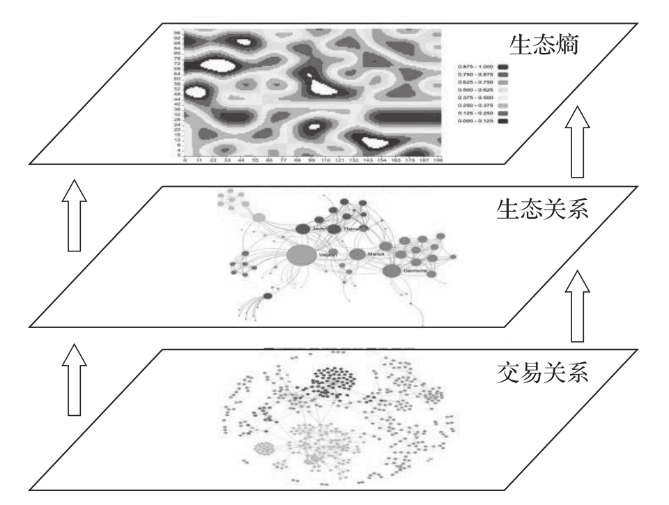 针对简单任务的众包设计过程,从生态学角度入手,建立众包设计生态网络模型,从交易关系、生态关系、系统有序性3个层面刻画众包设计生态网络状态;建立三层网络模型,分别描述众包设计生态系统中的交易关系、生态关系和生态熵,如图3-1所示。
