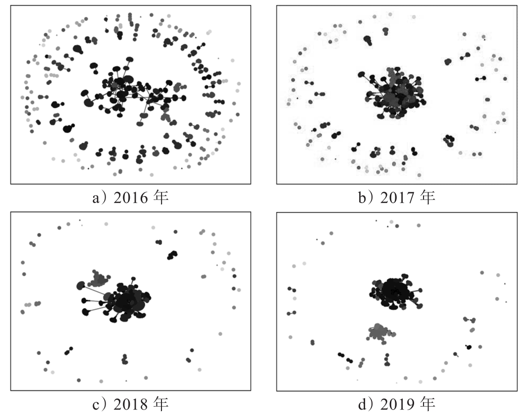 由图3-3可知,交易关系在2016~2019年出现了较显著的变化。2016~2017年聚集在中间的节点数量较少,大部分分布在四周,说明此期间交易关系较为均匀,没有集中到少数几个节点上。而2018~2019年中间的节点和连线明显增多,四周的节点减少,说明此期间交易关系大部分集中在中间的少数几个节点上,四周零散的交易已经较少。