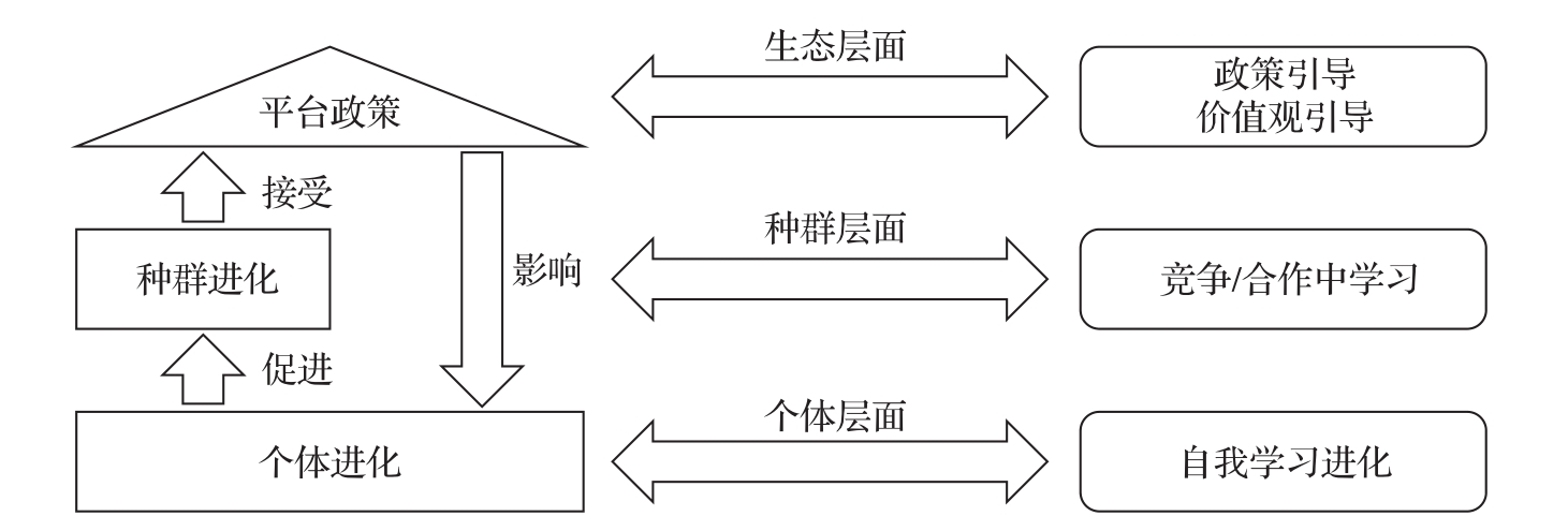 基于社会学习理论 [3-5] ,建立众包设计生态系统的演化模型,如图3-6所示。底层是个体演化层,模拟了单个主体在众包设计生态系统中经历自我进化的现象;中间层是多个主体相互学习、提高自身能力的组织演化空间;顶层是模仿政策、价值观推动的众包设计生态系统加速演进的文化空间,体现顶层设计及社会文化的影响。
