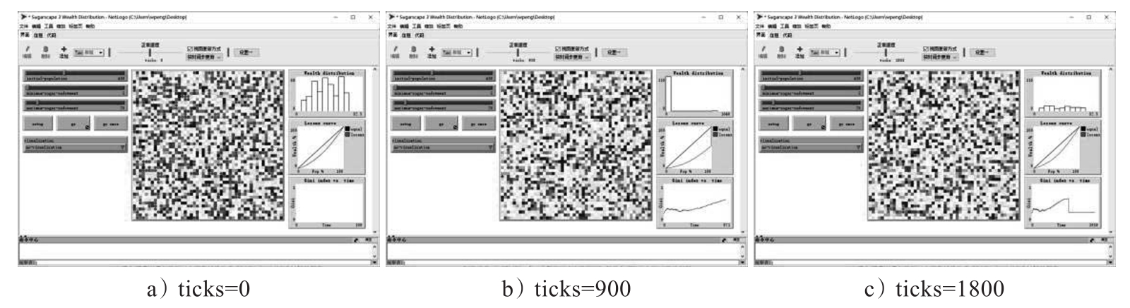 通过观察Agent种群财富的相关统计学参数、分布直方图、洛伦兹曲线 [11] 和基尼系数的动态变化,可以发现随着仿真的进行,Agent的贫富差距在不断加大。图3-7中ticks=900时,财富分布直方图和洛伦兹曲线非常直观地显示出,群体中90%的Agent只拥有不超过50%的财富,财富只掌握在少数人手中,与现实中贫富差距显著的社会现象十分契合。