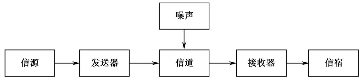 数据通信系统由数据信息的发送设备、接收设备、传输介质、传输报文、通信协议等组成。图2.1所示为香农定义的广义通信系统模型。其中,信源为待传输数据信息的产生者。发送器将信息变换为适合在信道上传输的信号,而信宿的作用与之相反。信道是指发送器与接收器之间用于传输信号的物理介质,又称传输介质。经过传输,在接收器处收到的信号在接收器处变为信息。通信传输过程会受到噪声的干扰,而噪声往往会影响接收者正确地接收和理解所收到的信息。为了把接收到的信息还原为原有信息,并为接收者所理解,需要一套实现约定的协议。协议是数据通信规则的集合,如果没有协议,那么两台设备即使连接也无法通信。