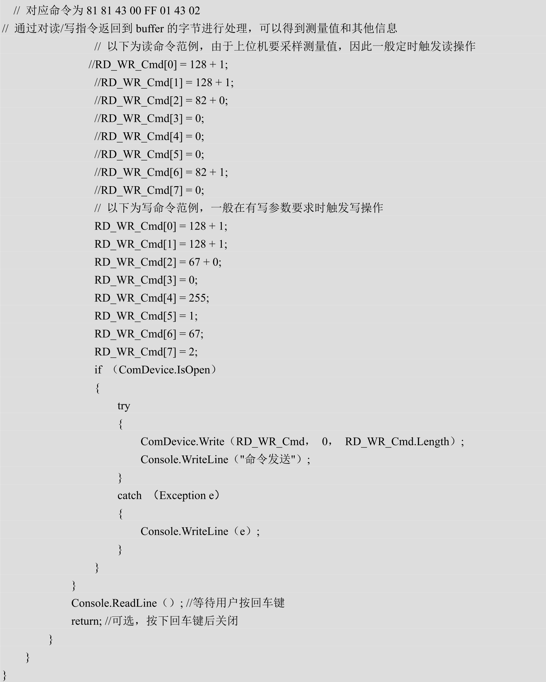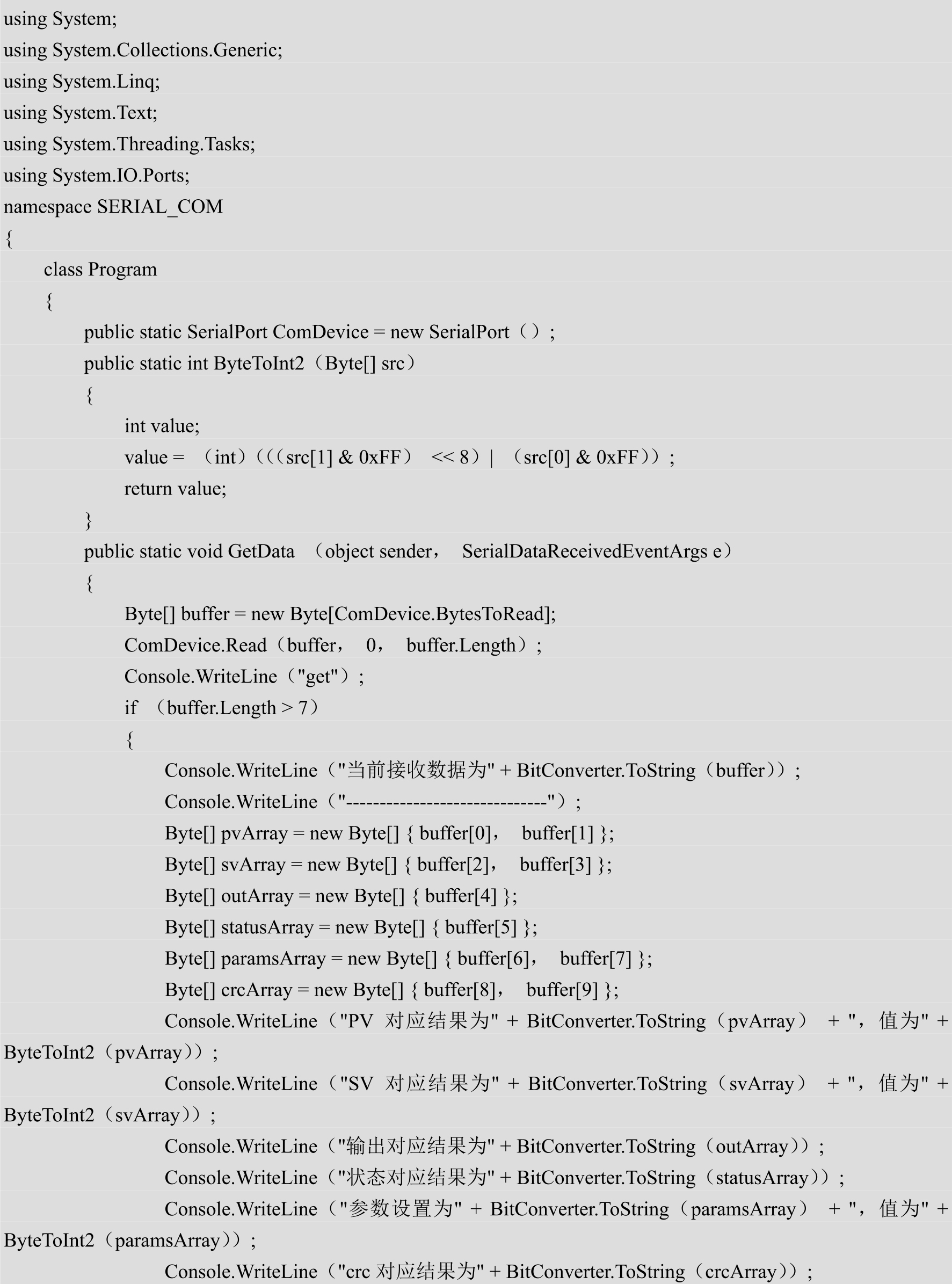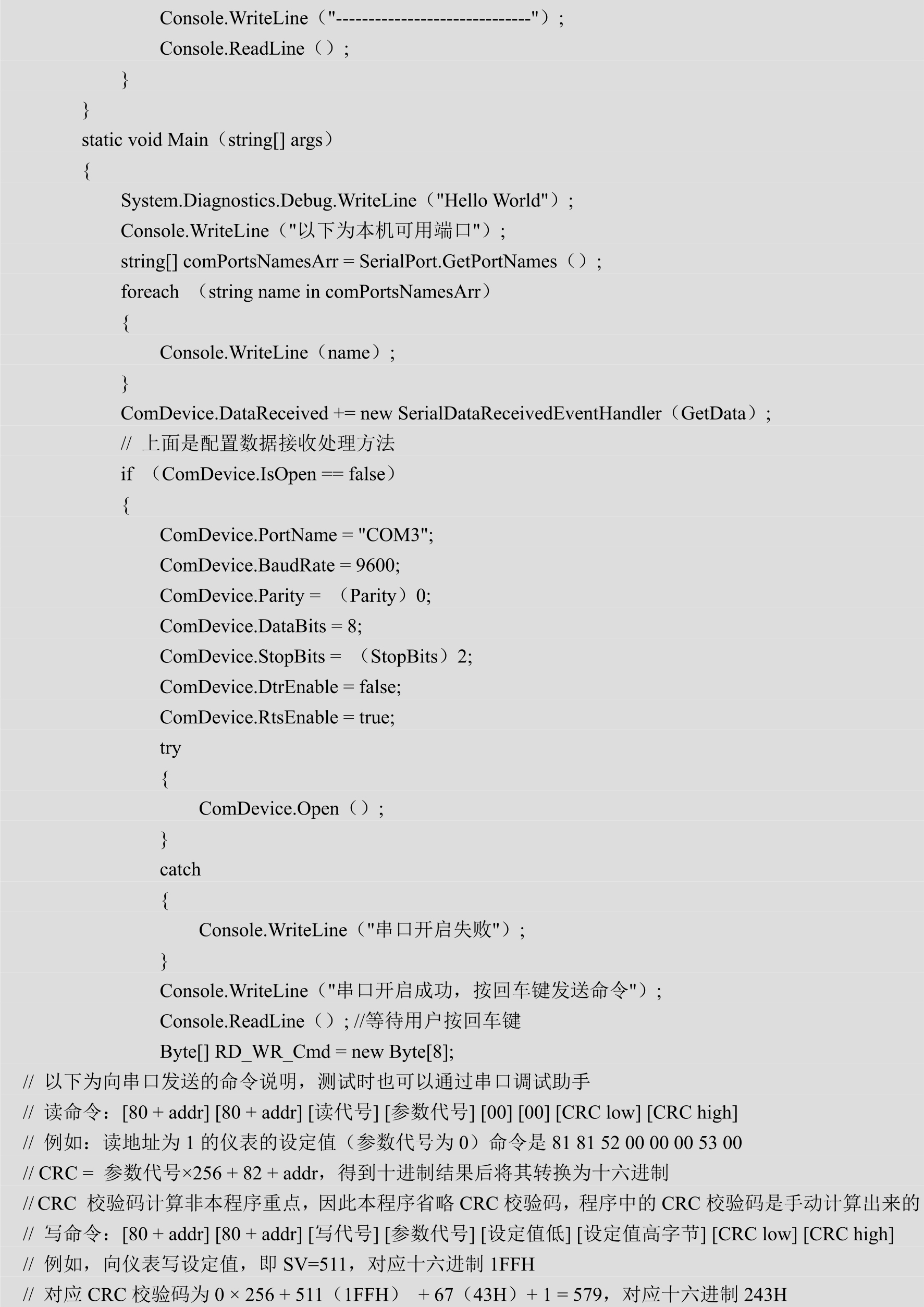 以下为利用C#语言在Visual Studio 2017集成环境下写的一段控制台(Console)程序。为了简化程序,这里以对一台仪表读/写为例。该仪表参数配置为波特率9.6kbps、无奇偶效验、8个数据位、2个停止位。测试中使用了RS-485/USB转换器,配置的串口号是COM3。