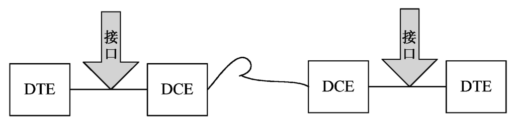 串行通信中有两个重要的概念,即数据终端设备DTE(Data Terminal Equipment)和数据电路终端设备DCE(Data Circuit-terminating Equipment)。目前常用的有关DTE和DCE之间的接口标准是EIA和ITU-T制定的标准。其中,EIA(Electrical Industrial Association,美国电子工业协会)标准有EIA-232、EIA-442和EIA-449等;ITU-T标准分为V系列和X系列。数据通信接口标准主要用来定义数据通信接口和信号方式,在通信线路的两端都要有DTE和DCE,如图2.2所示。DTE产生数据并传输到DCE,DCE将此信号转换成适当的形式在传输线路上进行传输。在物理层,DTE可以是终端、微机、打印机、传真机等设备,但是一定要有一个转接设备才可以通信。DCE是指可以通过网络传输或接收模拟数据或数字数据的任意设备,最常用的设备是调制解调器。