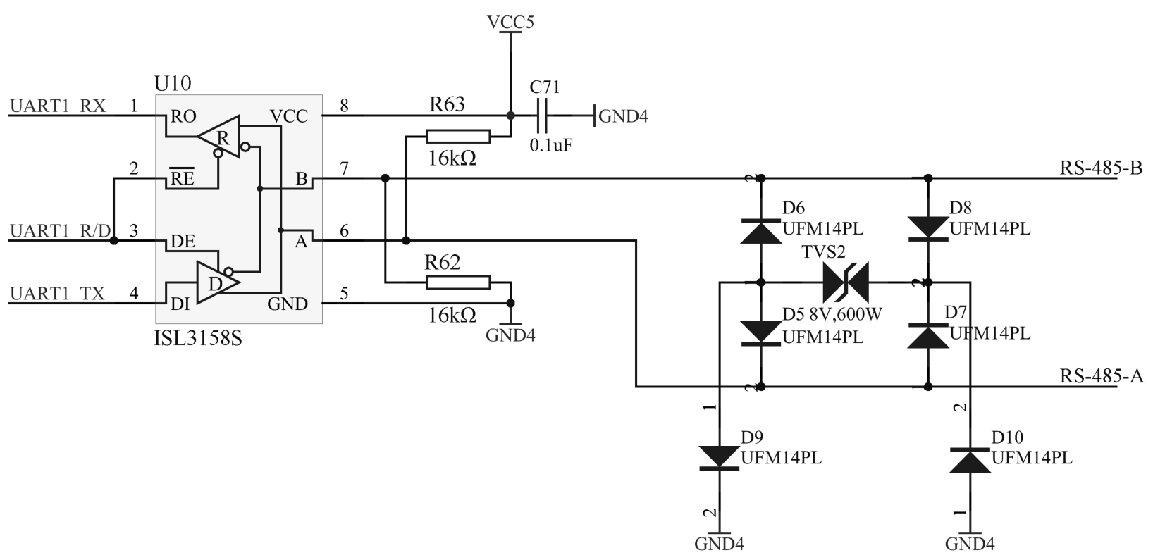 二线制接线方式对应ISL3158S芯片输出端的A引脚和B引脚。RS-485收发器存在一定的共模电压(-7~+12V),超出这个范围会影响通信网络的稳定性和可靠性,甚至会损坏RS-485接口。RS-485通信应采用屏蔽双绞线作为传输介质,同时A、B信号线在连接时都做了接地处理,且两个信号地使用同一个接地,消除了电平差,增强了抗共模干扰能力。但是,RS-485收发器只能抑制低频共模干扰,高频共模干扰会造成几百伏甚至上千伏的瞬态过电压,极易损坏RS-485接口。瞬态抑制二极管TVS2和二极管D5~D10组成了瞬态保护电路,能够将强大的瞬态能量泄放入大地,有效抑制高频共模干扰,提高RS-485通信的稳定性和可靠性。