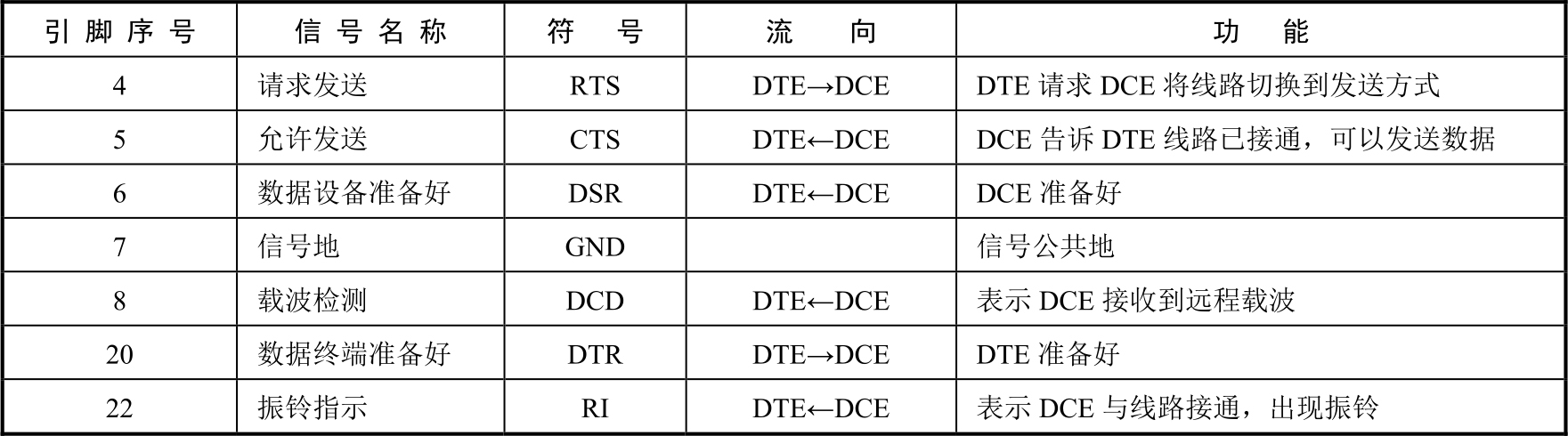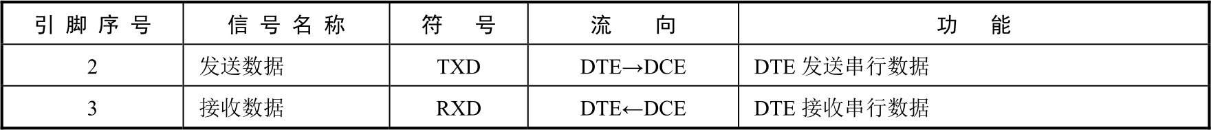 RS-232接口连线的功能特性主要是对接口各引脚的功能和连接关系进行定义。RS-232接口规定了21条信号线和25芯的连接器,其中,常用的是引脚号为2~8和20、22这9条信号线。实际上RS-232的25条信号线中有许多是很少使用的,在计算机与终端通信中一般只使用3~9条引线。表2.2展示了RS-232中常用的9条信号线的信号内容。RS-232接口在不同的应用场合所用到的信号线是不同的。例如,在异步传输中,不需要定时信号线;在非交换应用中,不需要某些控制信号;在不使用备用信道操作时,可省略5条反向信号线。