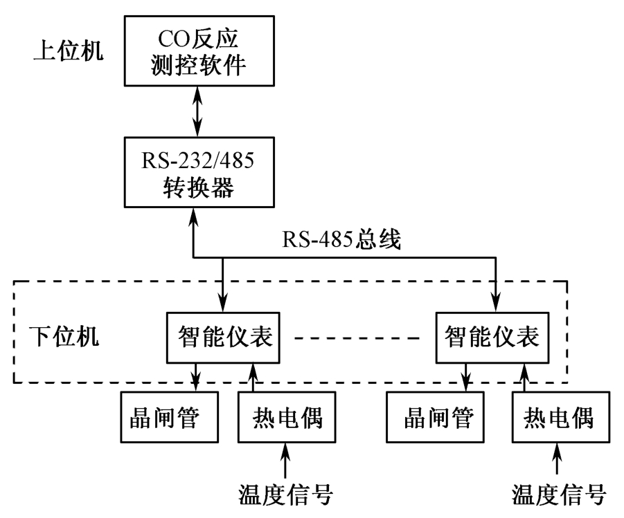 在一氧化碳中-低温变换反应中测量和控制的参数有脱氧槽温度、饱和器温度、恒温槽与反应器间管道的温度、中变反应器温度、低变反应器温度、中变和低变反应器中间管道的温度、配气流量、中变后引出分析的气体流量、系统内部与外部差压、中变和低变后的二氧化碳气体含量(进而可对其他组分进行物料衡算)。由于系统需要较多的温度控制,且设备分散,具备分散控制的特点,因此采用两级分布式测控结构,系统硬件结构图如图2.4所示。现场总线选用RS-485总线,直接将智能仪表挂接在RS-485总线上,通过RS-232/485转接器与PC串口连接。系统配置了6台智能仪表(宇电AI-808)及RS-232/485转换器一块,并为每个节点设备分配一个唯一的地址。温度控制由智能仪表完成,而上位机只对下位机实现远程监控功能,一方面接收现场智能仪表传送来的温度等数据,另一方面对现场智能仪表的温度控制设定值和其他参数进行更改。数据的上传下达通过RS-485总线在通信软件的控制下完成。