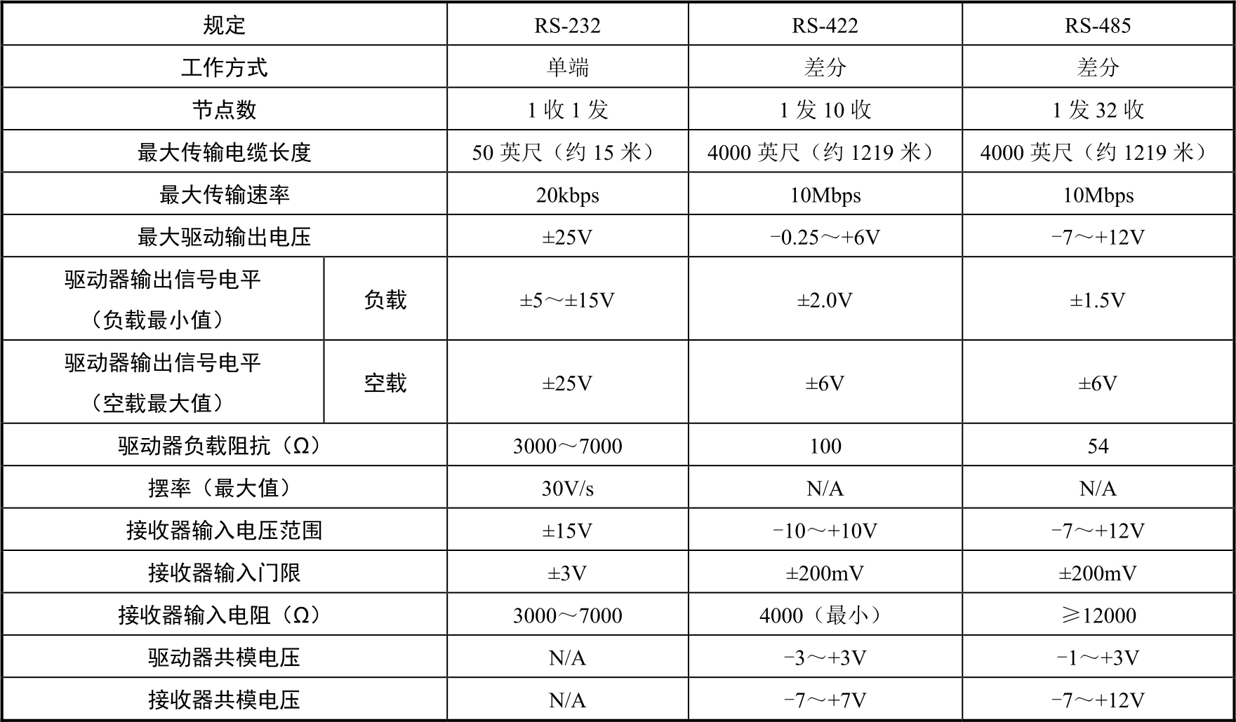 为扩展RS-422串行通信应用范围,EIA又于1983年在RS-422的基础上制定了RS-485标准,增加了多点、双向通信能力,即允许多个发送器连接到同一条总线上,同时增加了发送器的驱动能力和冲突保护特性,扩展了总线共模范围,后命名为TIA/EIA-485-A标准。由于RS-485是从RS-422基础上发展而来的,因此RS-485的许多电气规定与RS-422相似,如都采用平衡传输方式,都需要在传输线上接终端电阻等。RS-485可以采用二线与四线方式,采用二线连接可实现真正的多点双向通信。而当采用四线连接时,与RS-422一样,只能实现点对多的通信,即只能有一个主站,其余为从站。无论是二线方式还是四线方式,RS-485总线上可连接的设备最多都为32个。RS-485与RS-422的不同之处还在于其共模输出电压,RS-485为-7~+12V,而RS-422为-7~+7V。RS-485与RS-422一样,最大传输距离为4000英尺(约1219米),最大传输速率为10Mbps。