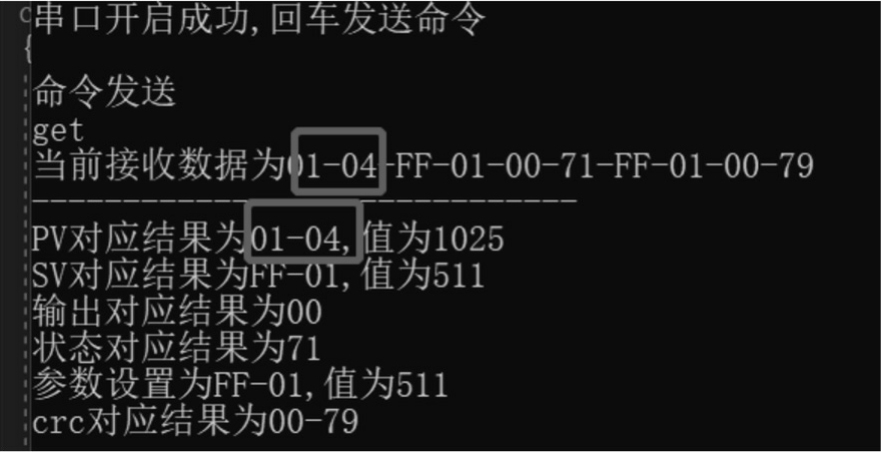 图2.5所示为执行写设定值返回结果的界面。这里需要注意的是,在返回的数据中,低字节在前,高字节在后。例如,测量值0104(十六进制数)要先变为0401,再转换为十进制数。其他字节也是这样处理。程序中的函数public static int ByteToInt2(Byte[] src)就包含此变换。此外,紧随设定值写指令后返回的设定值还是原先的数值,下个周期返回的数值才是前一个周期写指令写进去的数值。