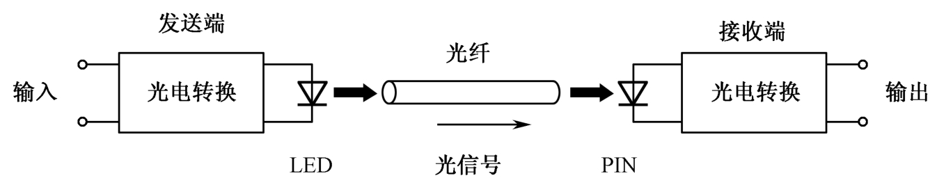 光源采用两种不同的发光管:多模光纤多使用较为便宜的发光二极管LED,而单模光纤多使用较为昂贵的半导体激光二极管ILD。光检测器是一个光电二极管,目前使用的是两种固态器件:发光二极管PIN检测器和雪崩光电二极管APD检测器。发送端与接收端之间的光信号在光纤中传输。由于光纤具有单向传输性,因此,要实现双向通信,必须成对使用光纤,一根用于发送数据,另一根用于接收数据。