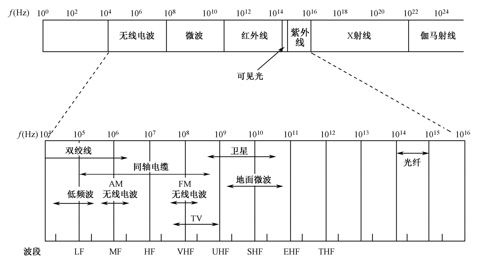 由于各波段的传播性能各异,因此可以用于不同的通信系统中。根据图2.17中电磁波的频谱可知,中波主要沿地面传播,绕射能力较强,适用于广播和海上通信;短波具有较强的电离层反射能力,适用于环球通信;超短波和微波的绕射能力差,可进行视距(两个没有障碍的点间,也就是视线距离内)、超视距中继通信。无线电波、微波、红外线和可见光部分都可以通过调节振幅、频率或波的相位来传输信息。紫外线、X射线和伽马射线更好一些,因为其频率更高,但是很难生成和调制,且穿透建筑物的性能不好,对生物也有害。