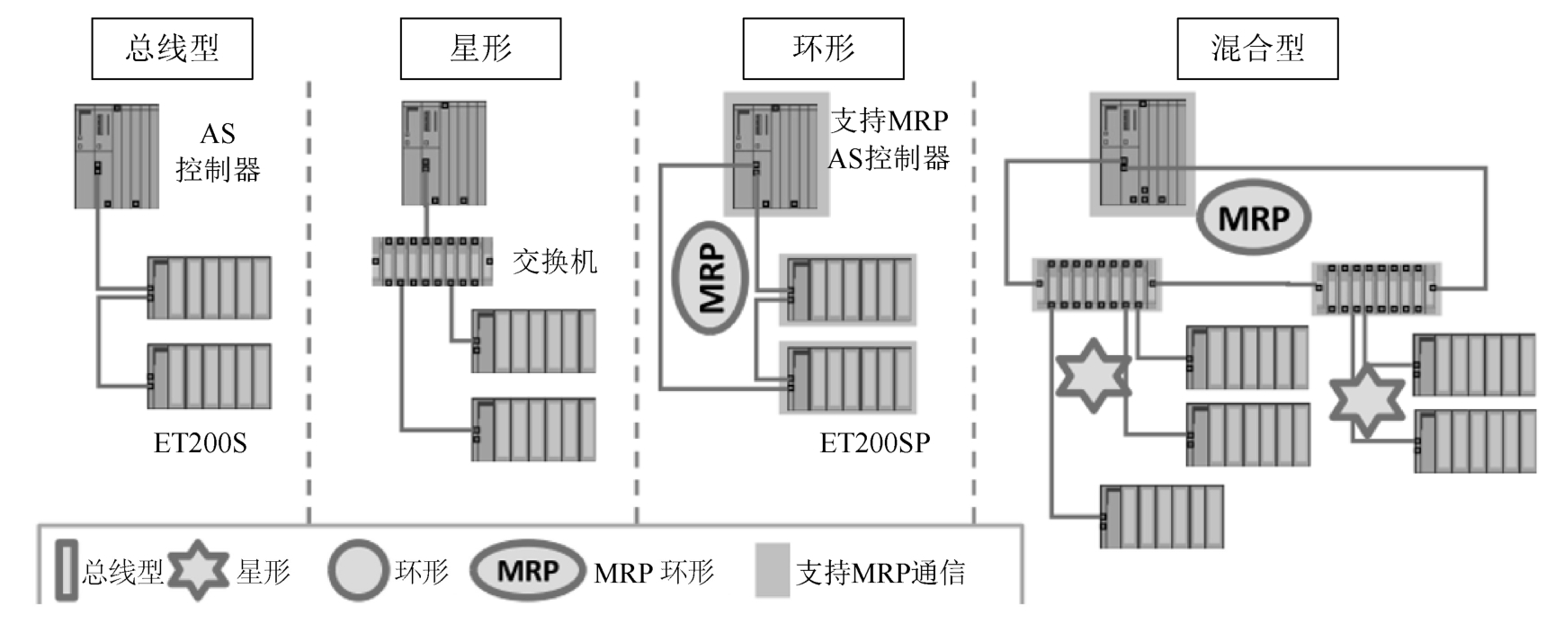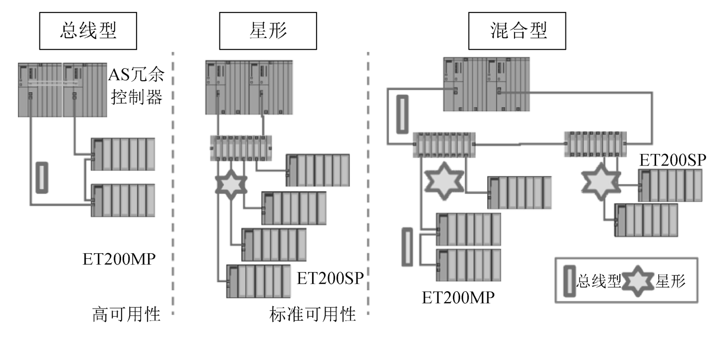 图2.23所示为西门子AS控制器与Profinet IO连接时的AS冗余系统的网络拓扑结构示意图。所谓AS冗余,是指采用2个AS控制器组成了冗余控制器。一般是2套CPU模块、2个电源和2个以太网模块及光纤等。其中,在总线型结构中,远程I/O也进行了冗余,因此属于高可用性。而星形结构I/O没有冗余,属于标准可用性。这里需要注意的是,图2.23中的混合型网络拓扑结构是总线型与星形混合而成的,而图2.22中的混合型是环形与星形混合而成的,这是因为图2.23中的冗余控制器是通过两个独立Profinet接口接入网络的,这两个Profinet接口并没有连接而使网络闭合,因此是总线型。在图2.22中,一个控制器的同一个Profinet接口的两个端口接入网络,使得网络闭合,从而构成MRP环形网络结构。