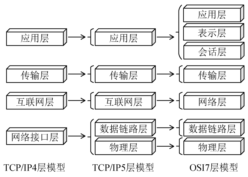 TCP/IP参考模型使用多层体系结构,主要有4层模型和5层模型,OSI参考模型与TCP/IP参考模型的对比示意图如图2.19所示。TCP/IP 4层模型具体如下。