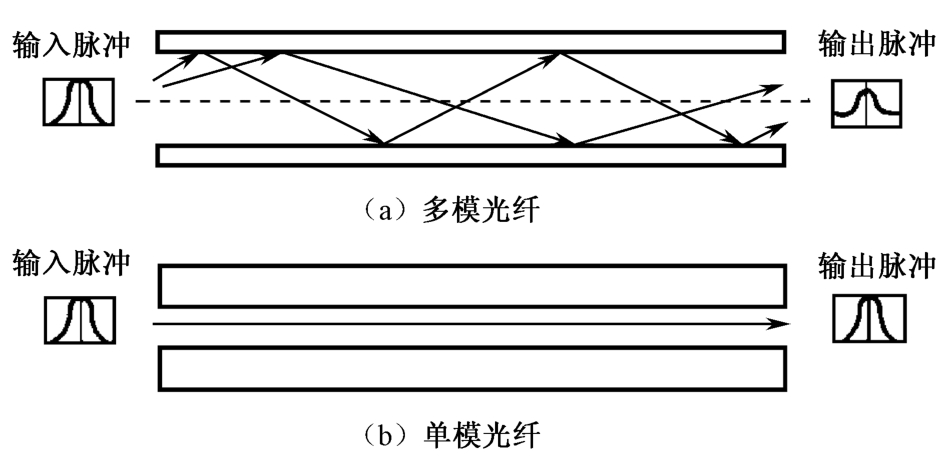 根据传输点模数分类,可以把光纤分为单模光纤(Single Mode Fiber)和多模光纤(Multi Mode Fiber)。单模光纤的纤芯直径小于光波波长(10μm),此时光纤就像一个波导,光在其中没有反射,而沿直线传播。单模光纤传输频带宽、传输容量大、传输距离远。多模光纤能容纳多条满足全反射条件的光线同时在光纤中传播,光束以波浪式前进。多模光纤的纤芯直径大多在50μm以上,包层直径在100~600μm之间。与单模光纤相比,多模光纤的传输性能较差。多模光纤与单模光纤的传输原理如图2.16所示。