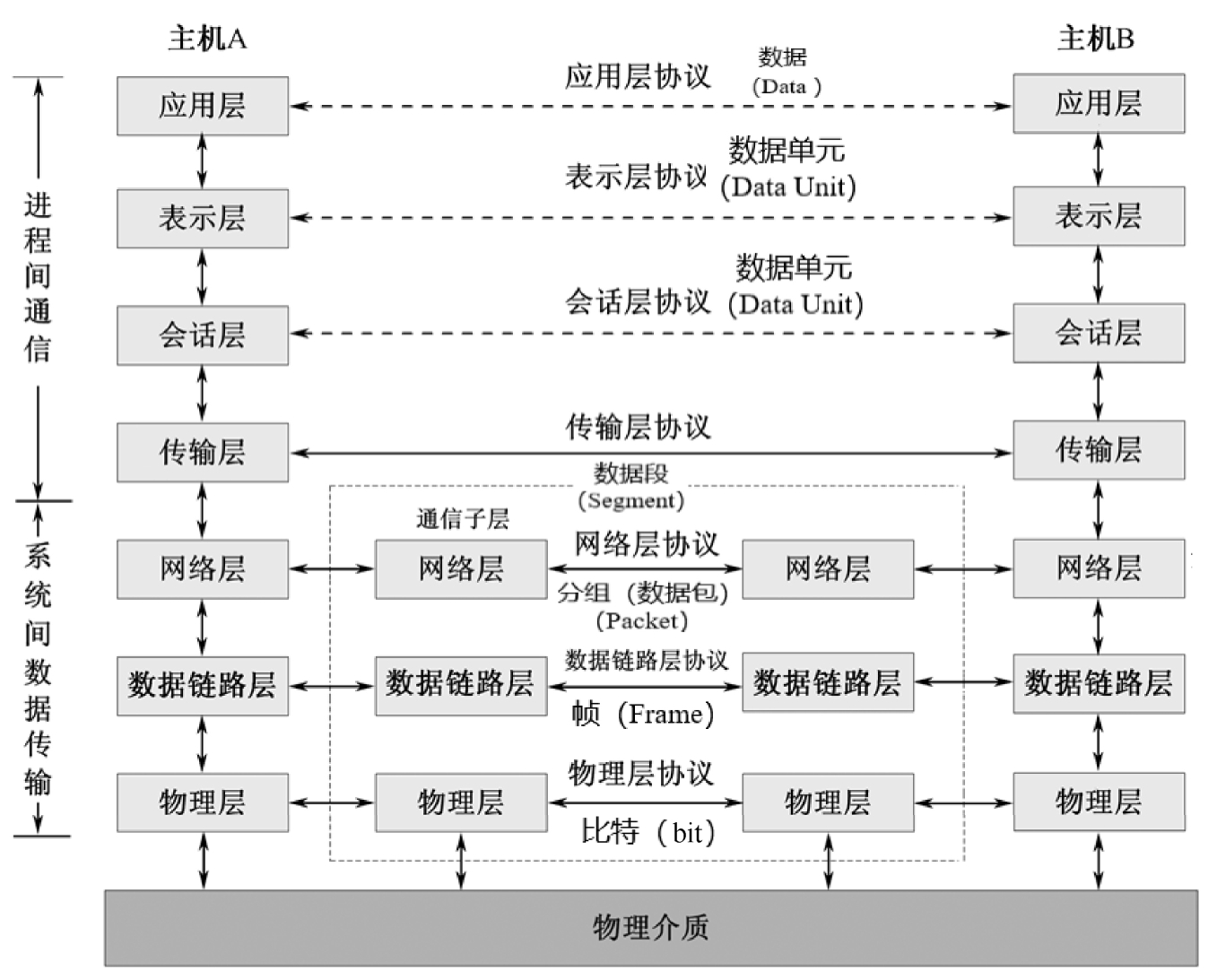 可以这样理解基于OSI参考模型的数据通信:当数据要通过网络从一个节点传输到另一个节点时,要从高层一层一层往下传,每一层协议都要在数据包上加对应的头部,这个过程称为数据封装。最终在物理层把二进制比特流数据转换为适合在相应介质上传输的信号(电信号、光信号、微波信号等)并进行传输。数据包到达目标主机后,主机将删除这些添加的头部信息,并根据报首中的信息决定如何将数据沿协议栈向上传给合适的应用程序。这个过程称作数据解封。通过数据解封,接收端的应用程序可以得到发送方发送的数据。
