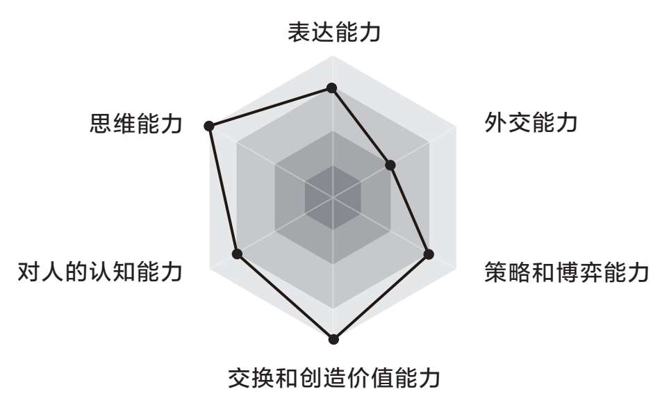 在这个图中,每个点代表了六大能力模块中的一种能力,能力越高,越向外延伸。我们可以先对自己的沟通能力做个评估,看看自己的能力图是什么形状的。等读完这本书,并运用其中的方法进行系统学习后,再评估一下自己的哪种能力模块获得了增长。
