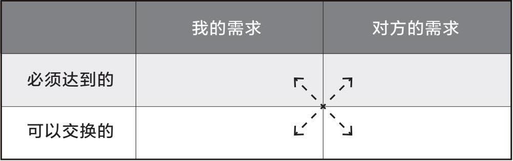 当然,现实生活中的各方需求,以及必须达到的需求和可以交换的需求,都是可能发生变化的。这个表格只是我们在准备沟通时的一个出发点,后期随着沟通的进行,你也可以随时对其做出调整。