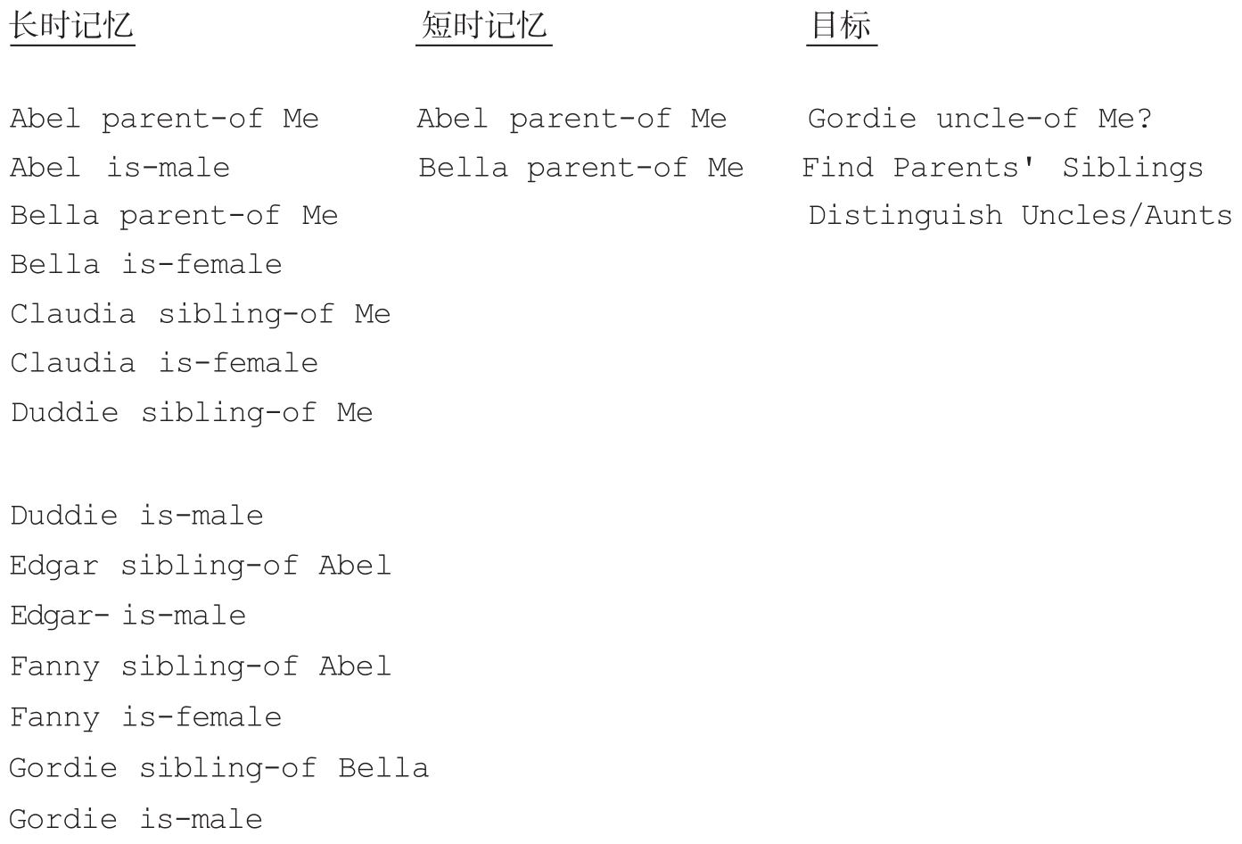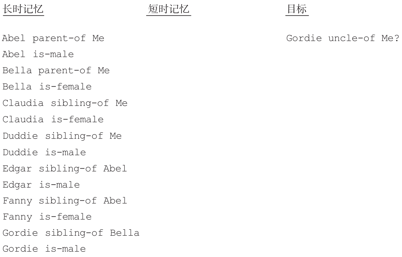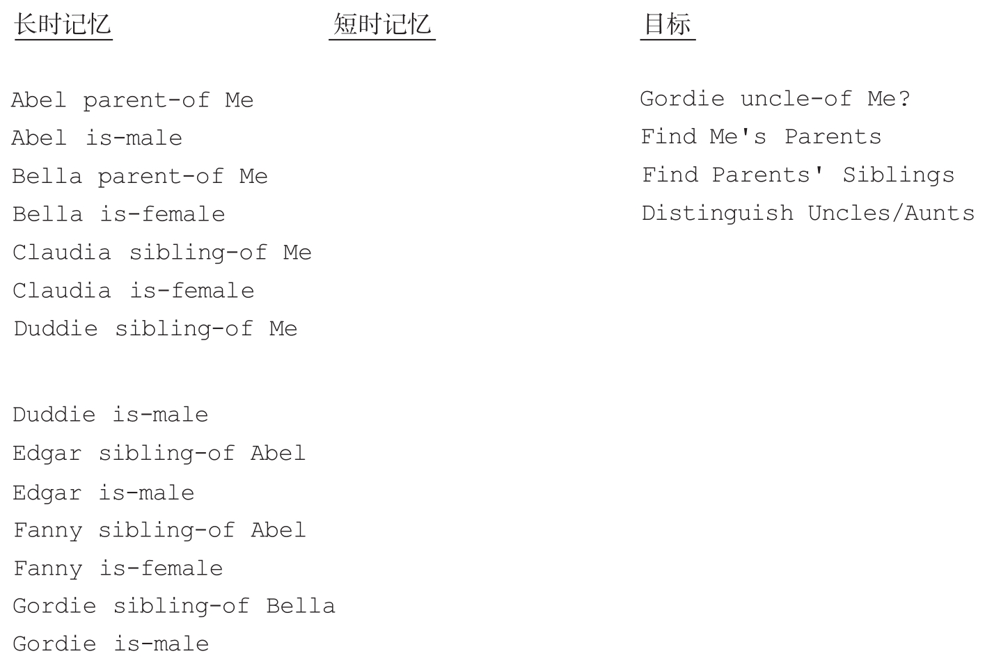 从概念上来讲,系统所面临的挑战是:它并不明确知道谁是谁的叔叔;而知识是隐含于它所知道的其他事情中的。从物理上来讲,同样的挑战是:在长时记忆中没有“的叔叔”这样的标记,而只有像“的亲兄弟姐妹”和“的父母”这样的标记。从概念上讲,我们需要从父母身份和亲兄弟姐妹身份的知识中推导出叔叔身份的知识。从物理上讲,我们需要一个“小幽灵(后台程序)”来打印一个“的叔叔”的铭文,从侧面标有“的亲兄弟姐妹”和“的父母”的铭文中发现相应的印记。从概念上讲,我们需要找到我们的父母是谁,找出他们的亲兄弟姐妹,然后选择男性。从物理上讲,我们需要下面的“小幽灵(后台程序)”,它在目标栏中打印出新的铭文,引发新的内存记忆搜索: