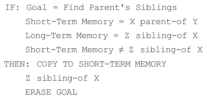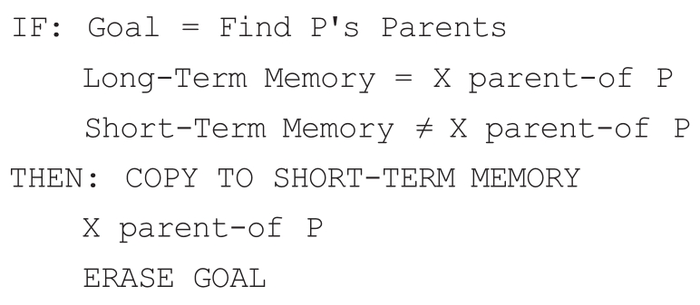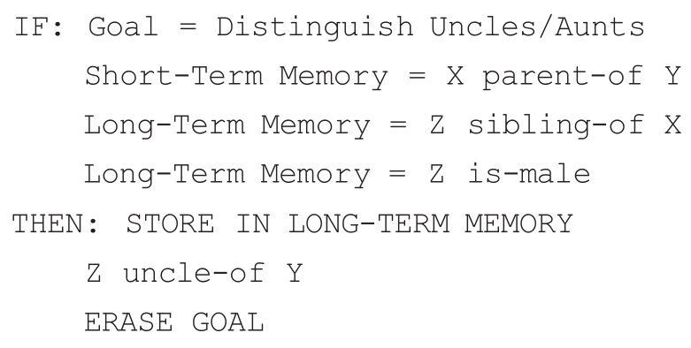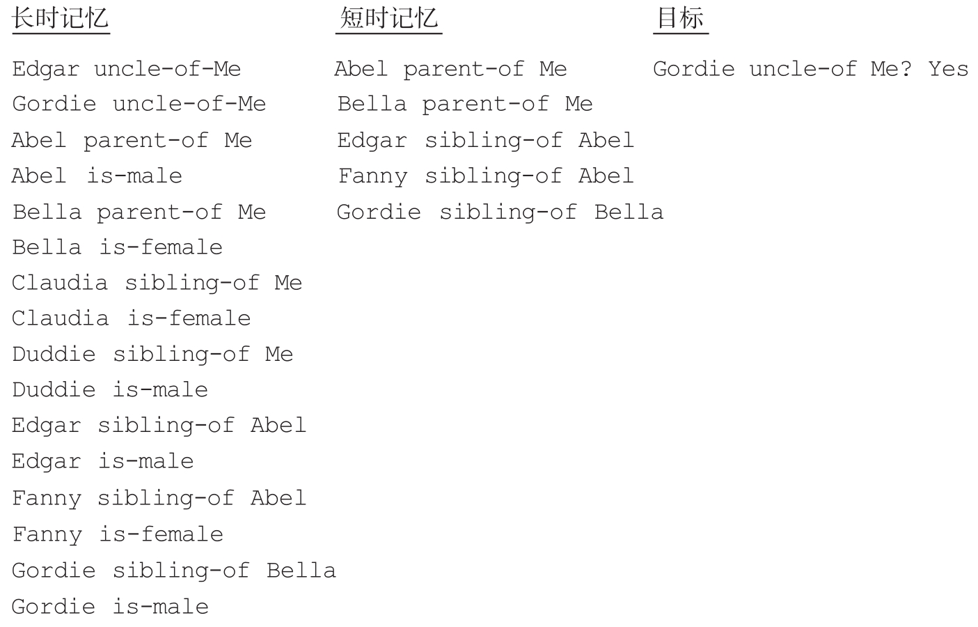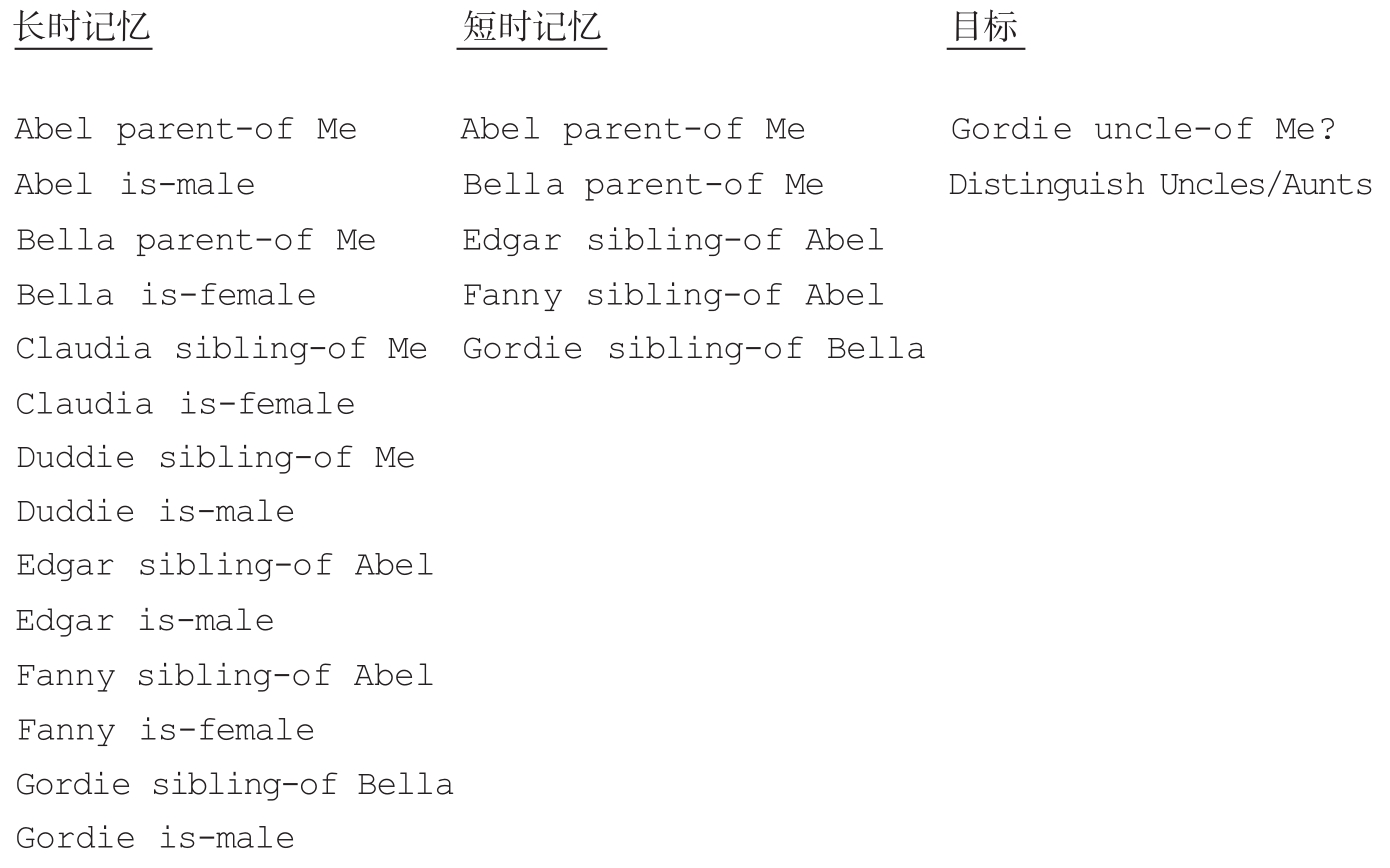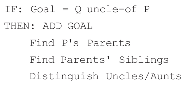 从概念上来讲,系统所面临的挑战是:它并不明确知道谁是谁的叔叔;而知识是隐含于它所知道的其他事情中的。从物理上来讲,同样的挑战是:在长时记忆中没有“的叔叔”这样的标记,而只有像“的亲兄弟姐妹”和“的父母”这样的标记。从概念上讲,我们需要从父母身份和亲兄弟姐妹身份的知识中推导出叔叔身份的知识。从物理上讲,我们需要一个“小幽灵(后台程序)”来打印一个“的叔叔”的铭文,从侧面标有“的亲兄弟姐妹”和“的父母”的铭文中发现相应的印记。从概念上讲,我们需要找到我们的父母是谁,找出他们的亲兄弟姐妹,然后选择男性。从物理上讲,我们需要下面的“小幽灵(后台程序)”,它在目标栏中打印出新的铭文,引发新的内存记忆搜索: